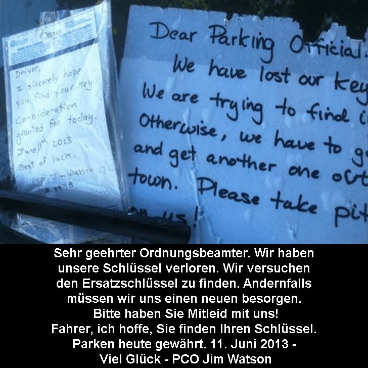 Aber wir sind sicher, dass dieser Kanadier, anstatt sich über die Situation aufzuregen, eine einfache Lösung im Sinn hatte. Deswegen einen Strafzettel zu bekommen, wäre natürlich unangenehm. Wenn man jedoch mit einem netten Schreiben den Polizisten die Situation erklärt, ist auch das Problem gelöst.