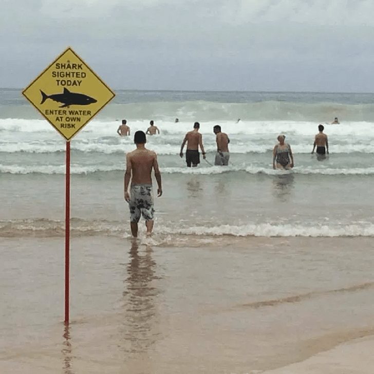 Niektórzy ludzie uwielbiają żyć na krawędzi. Mamy tu do czynienia z dużą grupą śmiałków, którzy kompletnie zlekceważyli wielki znak ostrzegający ich przed obserwacjami rekinów. Cały czas słyszy się o atakach rekinów, ale nawet kiedy ludzie słyszą o wypadkach, coś sprawia, że czują, że nigdy im się to nie stanie.