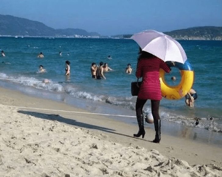 Ludzie nie mogą przestać patrzeć na tę kobietę, która wygląda, jakby była gotowa do pływania ze swoim gigantycznym dmuchanym pierścieniem, mimo że kroczy dumnie wzdłuż brzegu w sweterkowej sukience, legginsach, skórzanych szpilkach i skórzanej torbie. O czym ona myślała?
