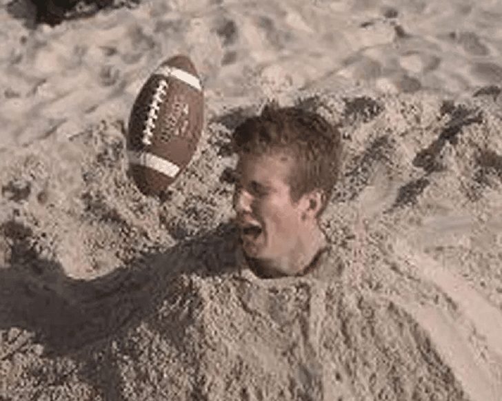 Pochowanie jego ciała tak głęboko uniemożliwiło mu obronę, gdy piłka futbolowa skierowana było prosto w jego twarz. To musiało boleć! Prawdopodobnie jest w szoku po ponownym zakopaniu w piasku. Jeśli kiedykolwiek zostaniesz pochowany przez przyjaciela, upewnij się, że masz łatwą drogę ucieczki.