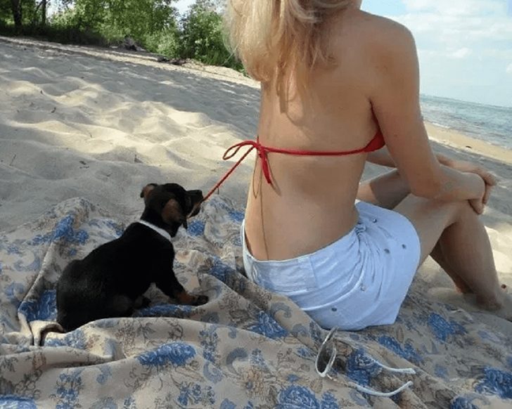 Jeden szczeniak rozwiązał stanik od bikini pewnej dziewczynie. Chyba do ostatniego momentu nie zdawała sobie sprawy z tego, co się dzieje. Wyobrażamy sobie, że później ganiała po całej plaży za szczeniakiem.