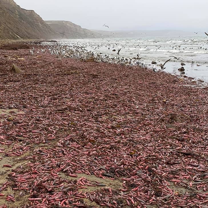 Dzikie zjawisko miało miejsce w grudniu 2019 roku w Drake Beach w Kalifornii, kiedy tysiące urechis unicinctus – gatunku robaka – woda wyrzuciła na brzeg. Robaki całkowicie przykryły piasek! Wyobraź sobie, że wybierasz się na plażę, a spotyka Cię taki widok!