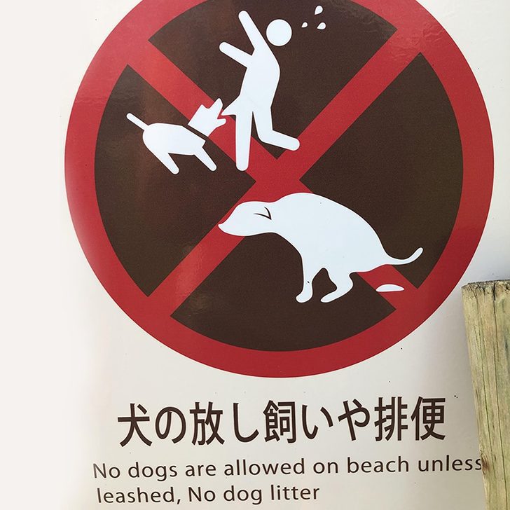 Tajlandia najwyraźniej nie ma problemu z odrobiną grafiki, jeśli chodzi o znaki ostrzegawcze, które można napotkać na ich plażach. Ten znak ostrzega nas, że psy nie mają wstępu na plażę, chyba że są na smyczy. Mówi, że to z powodu braku kuwety dla psów, jednak znak może być dość dwuznaczny.