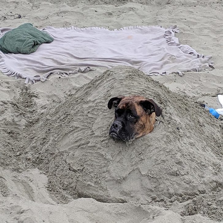 Ten człowiek powinien był przyprowadzić na plażę jednego ze swoich ludzkich przyjaciół zamiast psa, który nie wydaje się być zbyt zadowolony z faktu, że jego pan zakopał go w piachu, zostawiając jedynie mordkę.