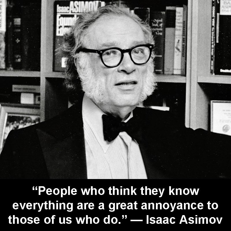 The late sci-fi writer Isaac Asimov was past the point of thinking he knew everything and was more interested in making fun of his arrogance. It’s interesting how self-deprecative quotes work: people end up transcending their flaws with self-criticism.