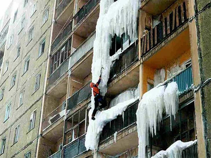 Remember the game Ice Climber? It is a 1984 title where players control two characters who climb their way through 32 levels while contending with various obstacles. Kind of like what the guy in the picture is doing. It’s unclear how so much frost built up on the side of the building.