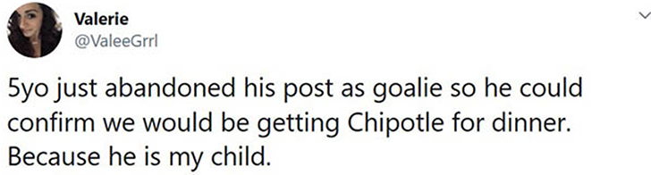 Chipotle fever takes over the soccer field as a pint-sized goalie makes a daring move! In a funny turn of events, a five-year-old child prioritized the craving for Chipotle over the duties of a goalie.