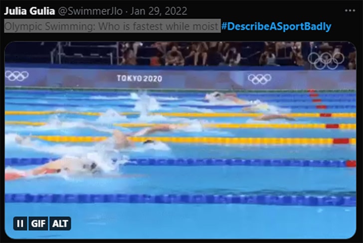 Does moisture play a significant role in the measurement of speed? The tweet portrays the athletes’ fierce competition with determined expressions and vigorous strokes, humorously referencing the sport’s requirement to be “fastest while moist” under the hashtag #DescribeASportBadly.