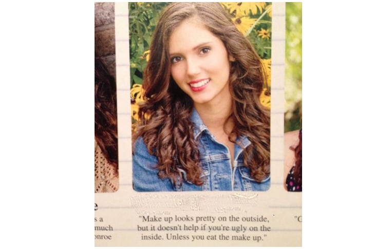 Understanding the concept of satire comedy is unusual for teenagers, let alone using it for a yearbook quote! But a girl successfully defies common assumptions, as she wrote a sarcastic joke about makeup for her graduation message. Luckily, it came out hilarious!