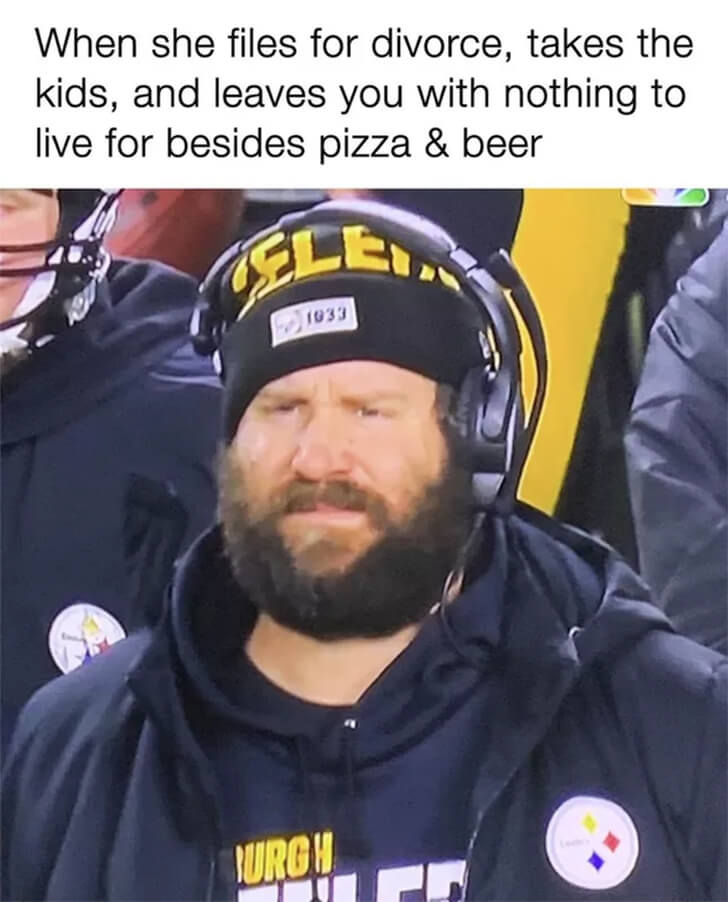 Ben Roethlisberger, a quarterback for the Pittsburgh Steelers, is known for his intense focus on the field, but in this meme, he appears lost and unsure. The caption suggests that indulging in comfort food and drink is the only solace for someone dealing with such a devastating situation.