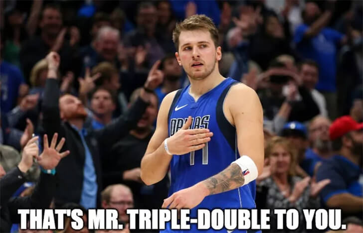The meme featuring Luka Dončić, a Slovenian professional basketball player for the Dallas Mavericks, is a playful reference to his impressive stats on the court. He has become known for his ability to record triple-doubles.