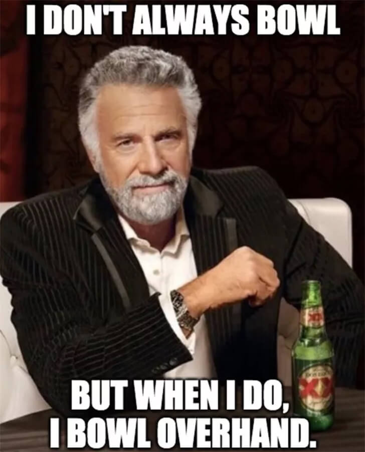 This is a humorous play on the popular advertising campaign “The Most Interesting Man in the World” for Dos Equis beer. Featuring Jonathan Goldsmith, this meme uses a humorous twist on the idea of bowling, which is typically done with an underhand throw.