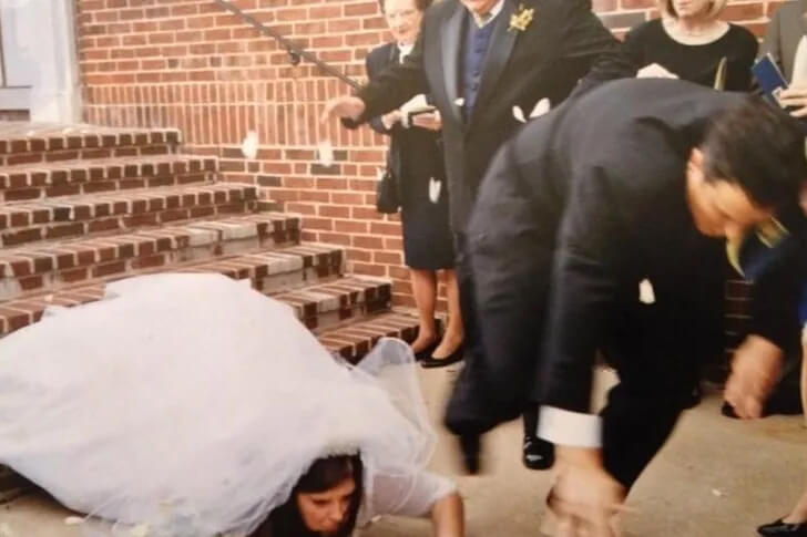 Diese Braut trat auf ihr Kleid, als sie die Treppe hinunterging und ihr tapferer Ehemann tat alles, um ihren Sturz abzumildern. Es gelang ihm leider nicht, seine Braut und ihr Kleid zu retten, denn auch er hatte damit zu kämpfen, nicht selbst auf die Nase zu fallen.