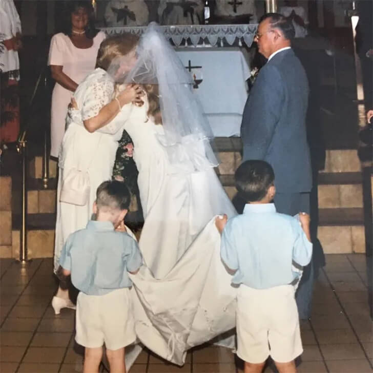 Wusstest du, dass laut unserer wissenschaftlichen Forschung Kinder der Hauptgrund für die meisten Hochzeits-Fails sind? Dieses Foto sieht unschuldig aus, aber die Person, die es gepostet hat, gab zu, dass das Kind, das das Kleid der Braut hält, ihr Sohn ist.