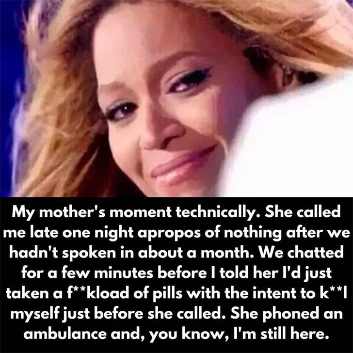 There’s no shortage of unbelievable tales on the list, but this one hits right in the feels. The author (presumably a woman) received the first call from her mother in a long time, right after she tried to commit suicide, and that caused her to confess and get the help she so desperately needed. Her mother’s instincts saved her life!