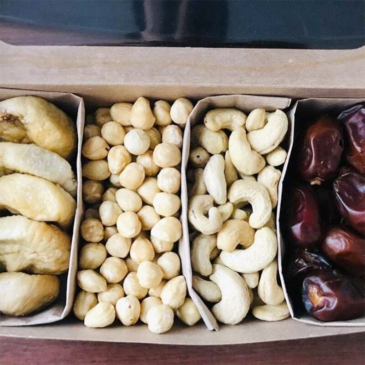 Nüsse und Trockenfrüchte sollten nie im Kühlschrank gelagert werden. Die kühlere Temperatur des Kühlschranks beeinträchtigt den nussigen Geschmack von Nüssen und kann Trockenfrüchte zu fest und eher geschmacklos machen. Bewahre Nüsse und Trockenfrüchte in einem luftdichten Behälter in der Speisekammer auf.
