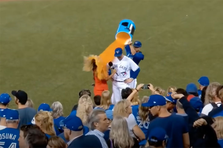A repórter esportiva Hazel May estava fazendo uma entrevista pós-jogo com Justin Smoak, do Toronto Blue Jays, que vinham desempenhando uma campanha exemplar na liga, quando foi pega de surpresa com um banho gelado de Powerade. Claramente não foi intencional, mas sobrou para ela!