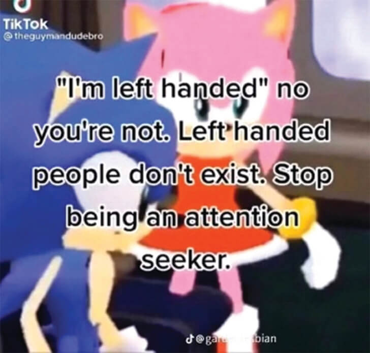This is obviously a joke because left-handed people do exist. They make up 10% of the population. As children, because of religious beliefs, many left-handed children are made to change their dexterity as it is associated with the devil or evil. This was the case with Kanye West.