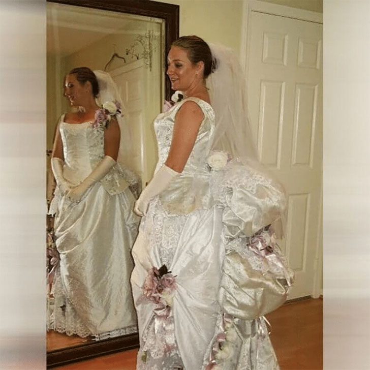 Jednak dla tej panny młodej lata osiemdziesiąte XIX wieku wydają się być inspiracją. Tył sukienki to tajemnica, ale nie jesteśmy pewni, czy jest to coś, co ludzie nosili w ostatnim stuleciu Nawet jeśli chciała pójść w styl retro, to z pewnością jej się udało.