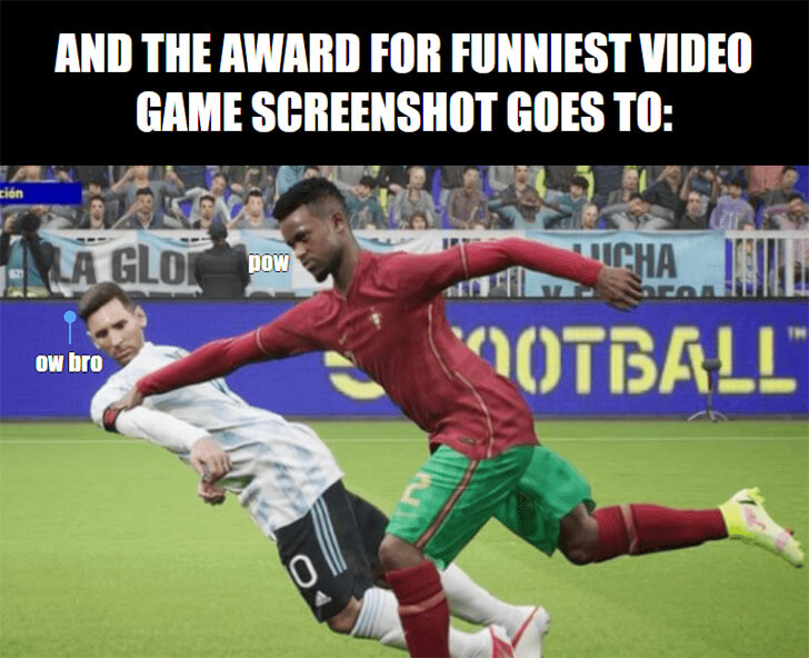 It looks like this one is from one of the FIFA games – Messi is taking a tackle, but it looks like he got punched and his head is twisted around. It’s pretty wild! It’s amazing how much detail goes into making video games, including glitches.