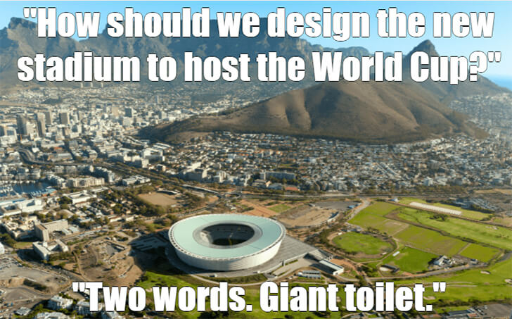 It’s funny to think about how the stadium for the World Cup was designed. Probably the team behind it had a lot of conversations about what it should look like. Then, one day, someone had a brilliant idea – to make it look like a giant toilet from the sky.